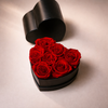 Red roses under a glass dome on a romantic dinner setting with candles and wine glasses.